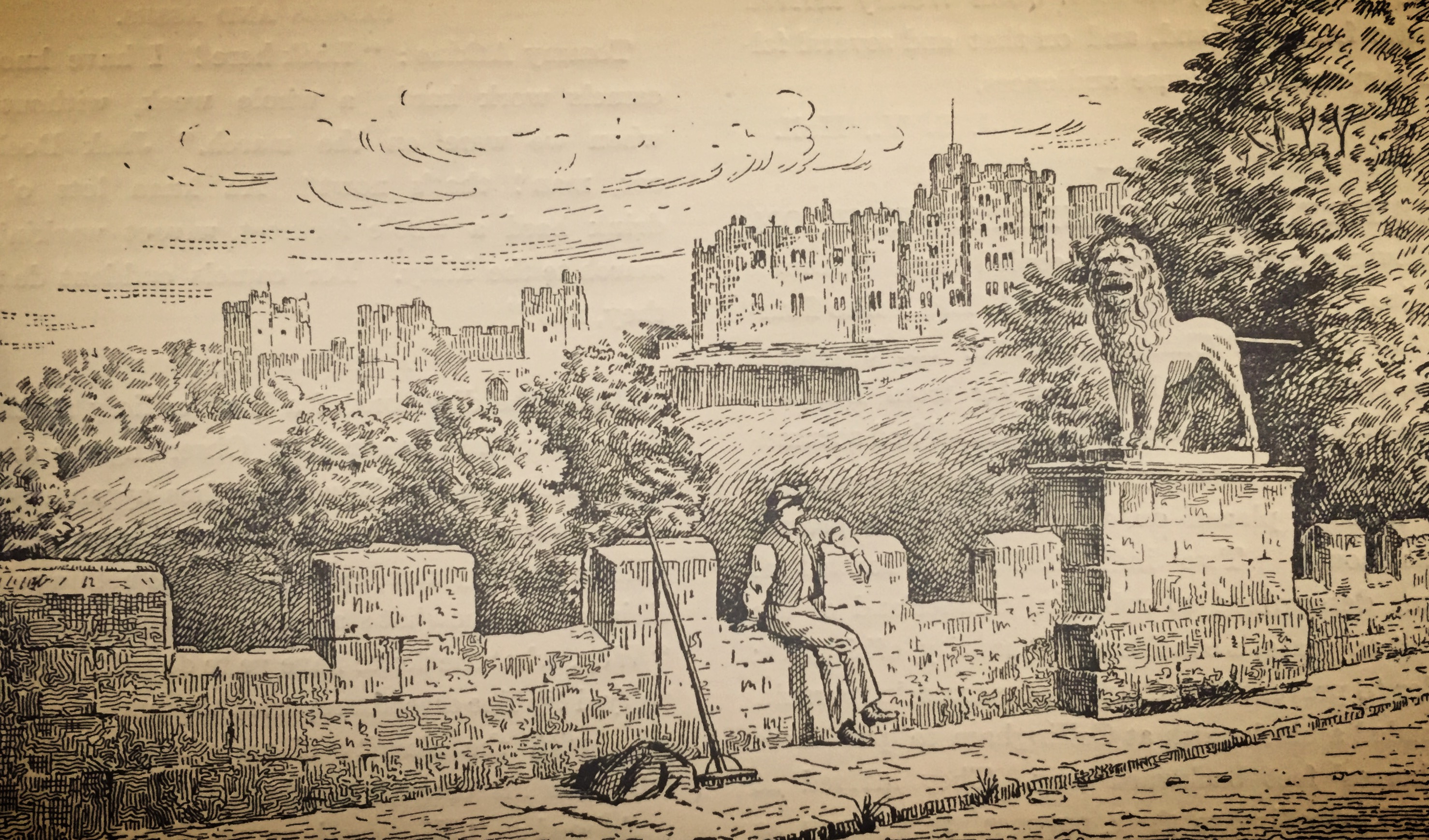 Many subjects engage the attention of the antiquary and the painter in the neighbourhood of Alnwick. The Castle, of course, stands first in importance, and it is this venerable structure which is delineated in our sketch, the standpoint being the Lion Bridge, itself a most picturesque object. From the battlements of the bridge a fairly comprehensive view of the castle may be obtained. Those who wish to include the bridge and castle in one grand scene will have to walk a short distance along the river bank. It is here that the artist may frequently be seen with busy pencil. The bridge figures prominently in Turner’s great picture of Alnwick by moonlight. An incident in connection with it is described by Oliver Wendell Holmes in his “Autocrat of the Breakfast Table,” as an illustration of the strange fact that trivial things are often remembered when more important ones are forgotten. ” I remember,” he says, “the Percy Lion on the bridge over the little river at Alnwick the leaden lion with its tail stretched out straight like a pump handle and why? Because of the story of the village boy who would fain bestride the leaden tail, standing out over the water which breaking, he dropped into the stream far below, and was taken out an idiot for the rest of his life.”