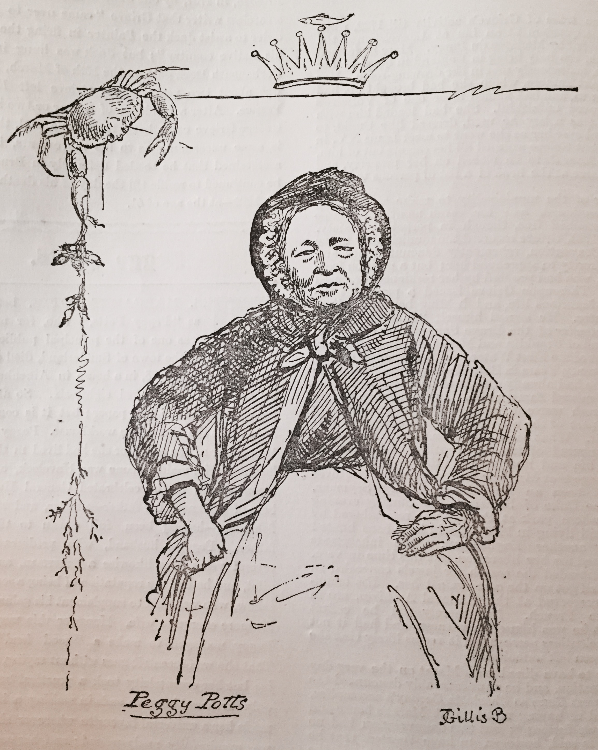 MARGARET POTTS, better known as “Peggy Potts,” who, for many years, was one of the principal public characters of the town of Sunderland, died on Sunday, the 10th October, 1875, in a house in Aikenhead Square, on the Low Quay, aged eighty-six. So at least says her obituary in the local paper ; but it is commonly believed that she died in the workhouse. Peggy was a true “daughter of the soil,” for she had lived in the town all her life. Her maiden name was Havelock, and she was second cousin to the celebrated General Havelock, the hero of Lucknow, her father — a sailor, and afterwards a fisherman having been full cousin to the general’s father. Peggy’s husband, who predeceased her by several years, was likewise a fisherman, and latterly a pilot, and he had the reputation of being a somewhat lazy fellow, who was glad to supplement his gains by those of his more energetic wife. However this may have been, Peggy managed to make a “good fend” for herself. That she was eccentric goes without saying, as the phrase is; but her eccentricity took a practical turn, which not only furthered her own ends in making a livelihood, but made her a universal favourite wherever she went. She was wonderfully ready-witted; and her command of the Sunderland vernacular, which she never dreamt of spoiling by any sort of refinement, was so perfect as to give a zest to every word she uttered.