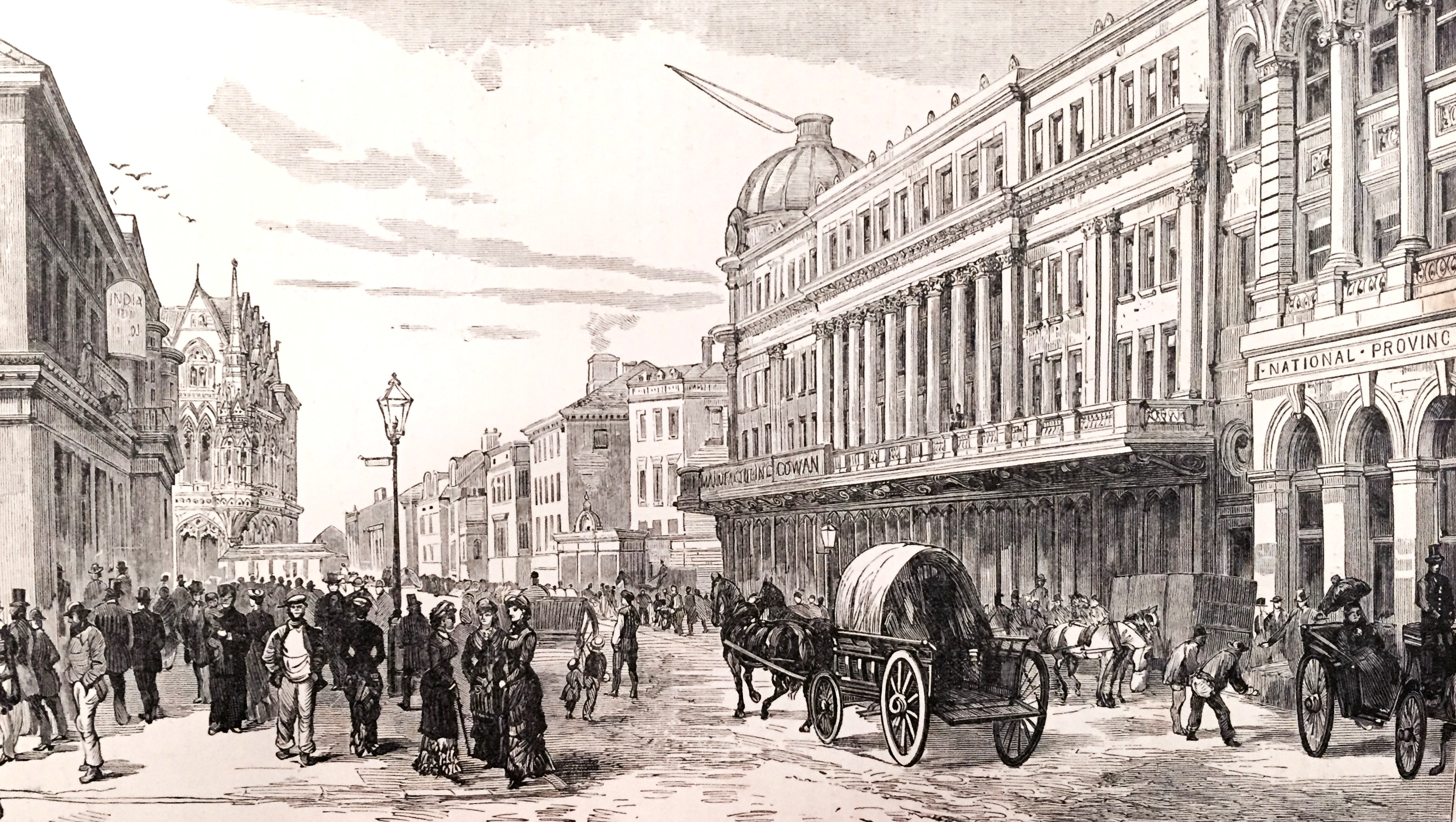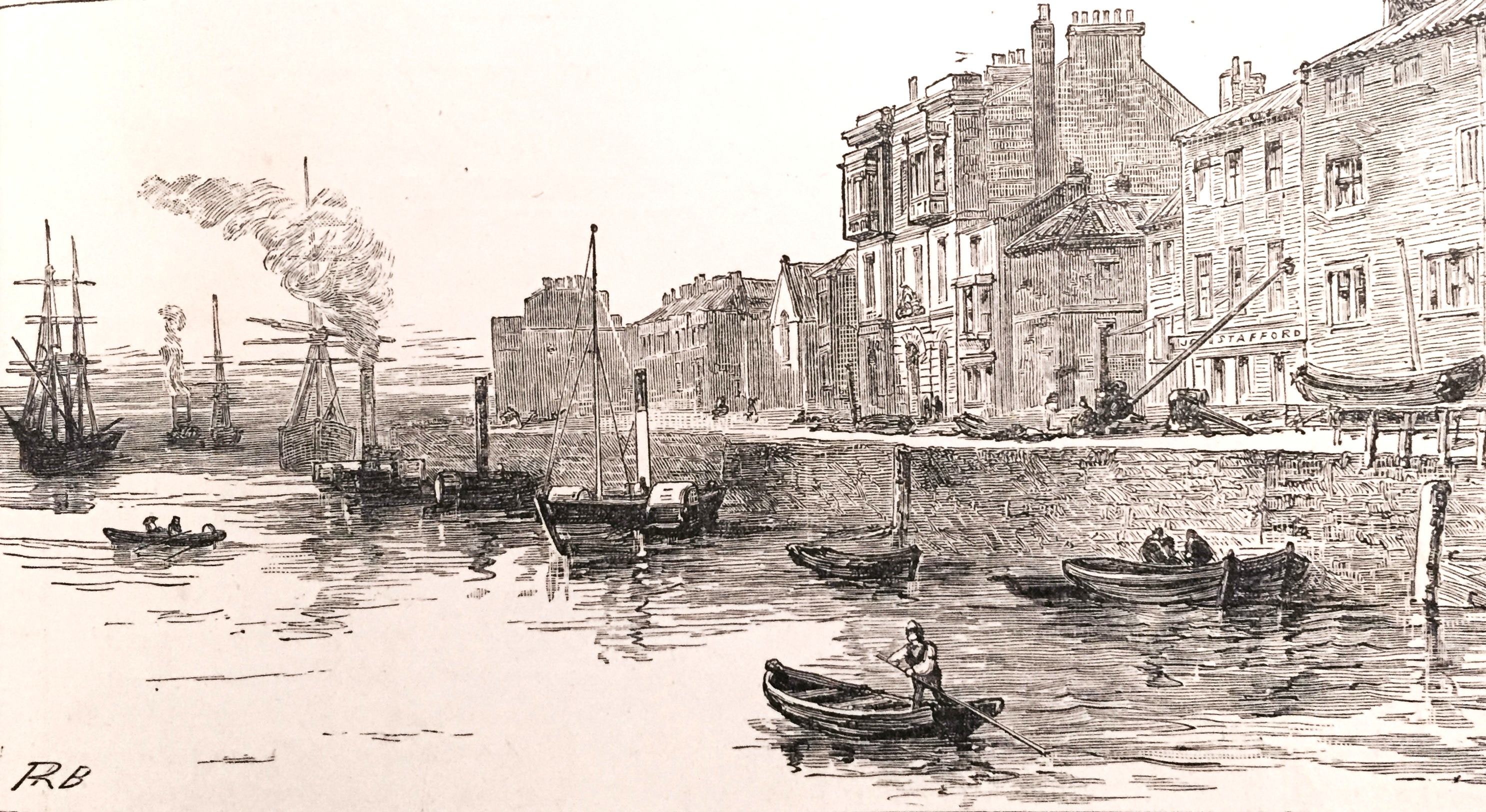 The principal street of Sunderland is the High Street, which stretches in a waved line from near the parish church of Bishopwearmouth, almost to the docks at the east end of the town a distance of more than a mile. It seems hard to realize that not more than a century ago part of this street was still a country road, bounded by green hedgerows. Hutchinson, writing about the year 1785, speaks of the ground which borders High Street being “now eagerly sought after by persons of opulence and trade, who have arranged handsome villas on each side of the road, so that in a few years the buildings of these places will meet.” Where are those handsome villas now? Two of our engravings are views in High Street. One of these, “Upper High Street,” shows the best and busiest part of the thoroughfare. The spectator is looking westward, and a little before him, on the right, Bridge Street branches off, leading by the famous Sunderland Bridge to the neighbouring town of Monkwearmouth, and to the roads to Shields and Newcastle. Our second view of the same street, “Lower High Street,” depicts a more shady neighbourhood, a neighbourhood which grows more shady still as we go forward in the direction in which we are looking. The building on our left, with the arcade of open arches, is the old Exchange, built in 1813, and now used as a Seamen’s Institute, whilst the street which branches off on the same side a little further away Bodlewell Lane leads down to a long, narrow, unsavoury thoroughfare, known, not inappropriately, as “Low Street.” Eastward this street terminates at the commencement of the Quay, parts of which used to be designated Custom House Quay, Ettrick’s Quay, and Bowes’s Quay, but the whole of which is now known generally as the “South Quay.” On the land side of the Quay there are a few quaint old buildings, and views may be got, looking seaward, which are worthy of the artist’s attention. A view of the Quay, as seen from the river, forms one of our illustrations.