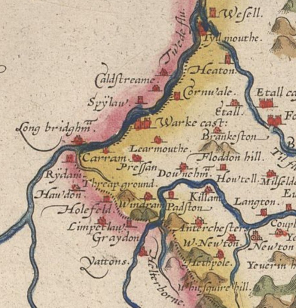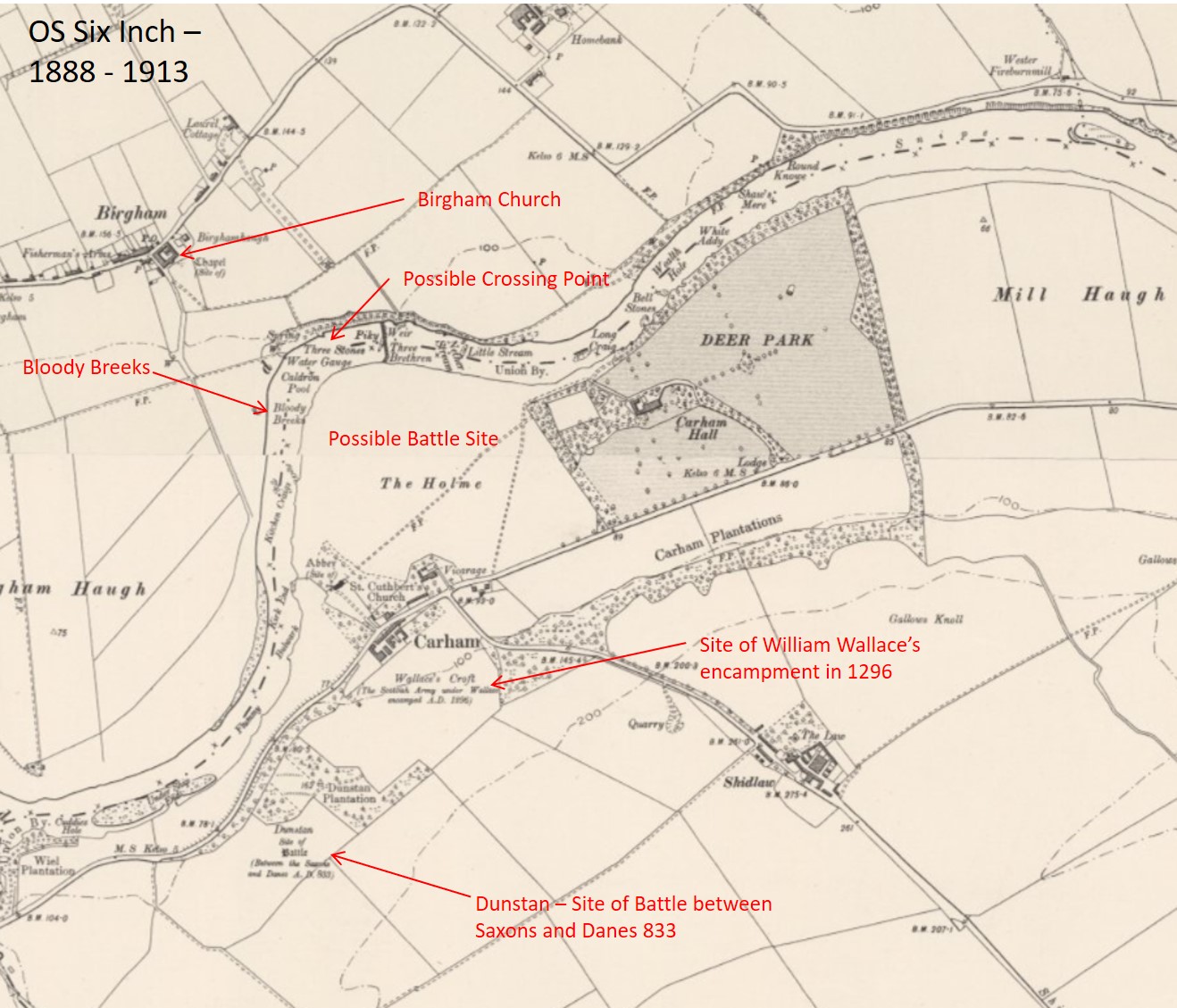 However, following the work done by members of the Society and archaeologists (Passmore and Waddington in their work, Managing Archaeological Landscapes in Northumberland) the site of the battle is now thought be further west, to the north of the settlement of Carham itself, on the banks of the River Tweed. There are several lines of evidence to support this. Carham was, at the time, an important ecclesiastical centre. The settlement lies on the line of the Roman road linking Tweedmouth to Dere Street and it is likely that there was river crossing over the Tweed between Carham and Birgham (on 16th Century map by Saxton Birgham is called Long Bridgham). All signs that this area was a cross roads and likely invasion route. To the south of Carham is an area called Wallace Croft in relation to its use by William Wallace as an encampment for his invading army in 1296 (OS Six Inch, 1888 – 1913). There is a weir or ford crossing the River Tweed, at the end of an ancient path which leads from Brigham Church, which could suggest the location of the former crossing. Crossings can still be made at low water levels during the summer. Interestingly, again on old OS mapping, a point on the river adjacent to this area is referred to as Bloody Breeks. Descriptive names such as this are commonly associated with battlefields (Bloody Meadow at Towton for instance).
