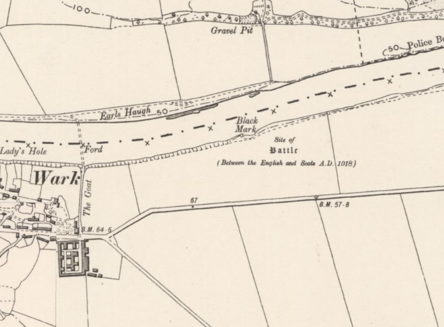 The Battle of Carham Society has done some excellent work on researching potential battle sites. Local memory had it that the battle was fought on the south side of the River Tweed, just to the east of Wark. The earlier editions of Ordnance Survey mapping similarly put the location of the battle to the east of Wark (the date is sometimes 1018 and sometimes 1016).