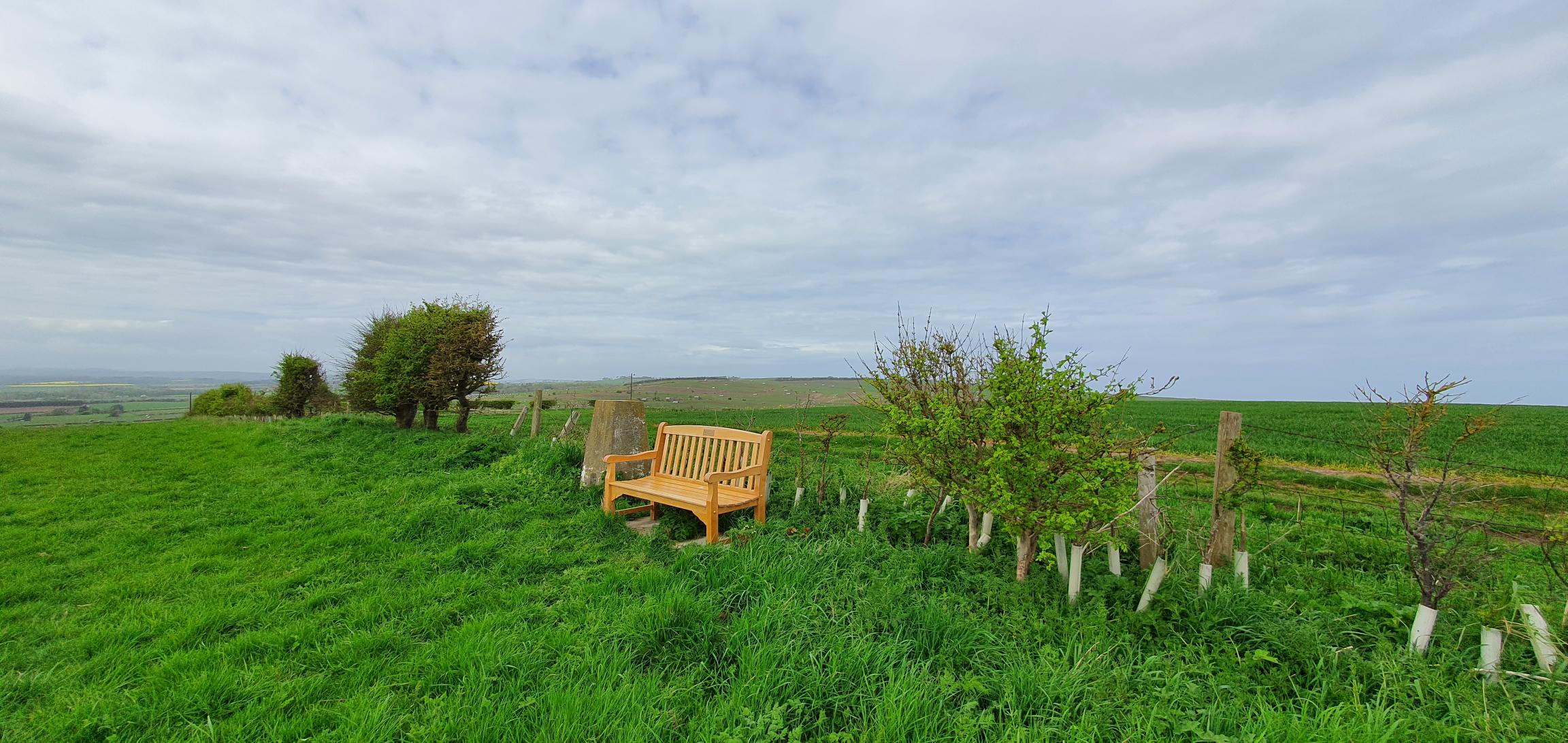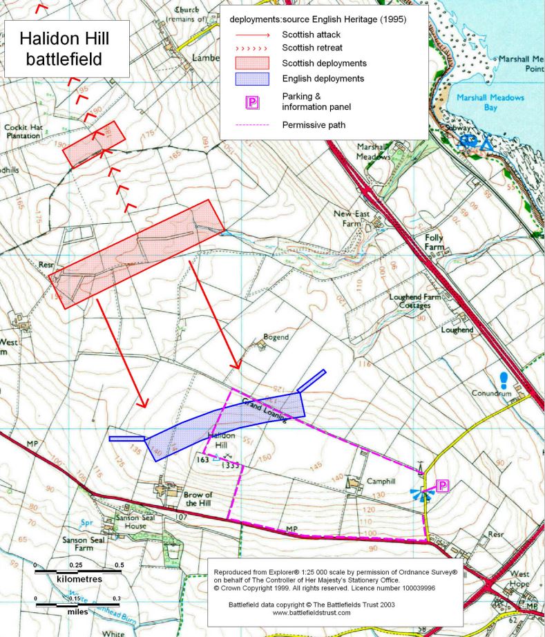 A walking route around the battlefield is accessed just off the A6105 (Duns Road). Post Code TD15 1UD takes you to a small car park and there are information boards which show you the routes of the walk. On a good day you will be provided with some breath taking views of the border country and will fully appreciate Edward III’s reasoning for choosing this site to give battle. A concrete triangulation point, and wooden bench mark the summit of Halidon Hill.
