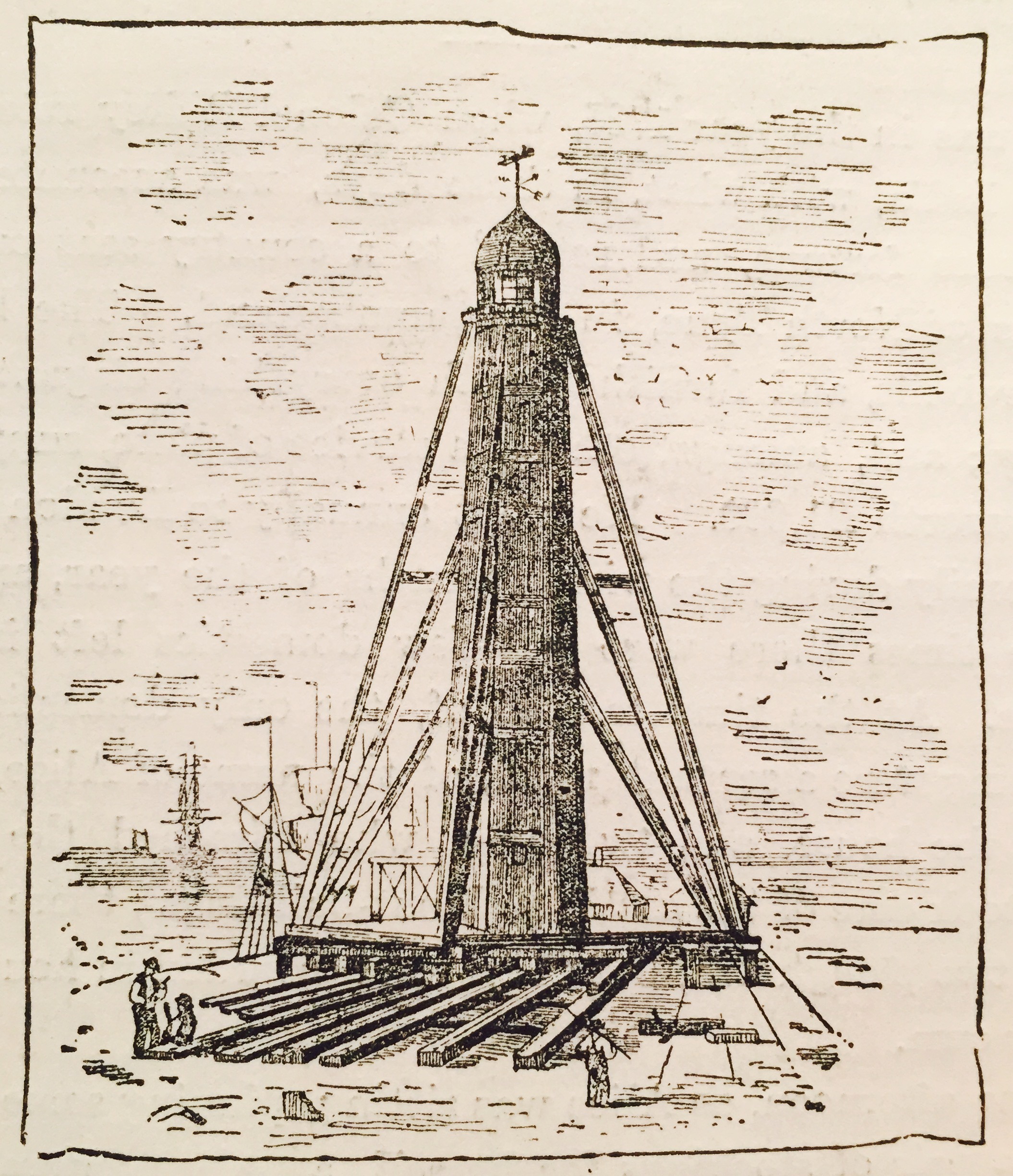A triumph of engineering skill was accomplished in Sunderland when the lighthouse at that port was bodily removed from one end of the pier to the other. The former site, which was on the old pier, had become much impaired, and the new pier having been extended considerably to the east, it was deemed desirable that the lighthouse should stand as near the new pier end as possible. It was at first intended to take down the lighthouse and rebuild it; but Mr. John Murray, the engineer under whose direction this extraordinary effort was performed, proposed to remove it entire. As a proof of the feasibility of the plan, it was stated that houses in New York had been removed from their original situation to a considerable distance without sustaining any injury whatever; that the immense block of granite forming the pedestal of the statue of Peter the Great, at St. Petersburg, was conveyed four miles by land and thirteen by water; and that obelisks had also been transmitted from Egypt to Europe. The removal of Sunderland Lighthouse, however, was considered a more dangerous undertaking, from the circumstance of its being composed of stones of comparatively small dimensions, as well as from its great height and small base. The arrangements suggested by Mr. Murray were: “That the stone work at the base, which is 15 feet in breadth, should be cut in detached parts, and timbers introduced so as to form an artificial base, and which should also act as a mooring carriage to consist of eight Memel baulks, beneath which other baulks should be laid with iron rails forming a railway. Each baulk of the carriage rested on 14 iron wheels, and from the extremities of the carriage on all sides large timber stays were erected, so ad to support the body and top of the building.” The building had to be drawn about 30 feet to the north, and 420 feet to the east, by powerful screws, along a railway, on the principle of Morton’s patent slip for the repairing of vessels. The necessary preparations having been effected, the work of removal was first taken several yards in a north-easterly direction. Rails were laid to convey it forward to the easterly extremity of the pier. During the week commencing with Monday, the 14th of September, 1841, the lighthouse was moved daily more than 30 feet in about as many minutes, including stoppages; but whilst actually moving it went at the rate of about two feet in a minute. Whilst the work was proceeding the screws were abandoned, and the building was drawn forward on the railway by ropes affixed to three windlasses, thirty men being engaged in this part of the work. The line of way was laid on a curve in order to bring the reflector round to a due east position. Much of the time occupied in the process was engaged in shifting the ways, which could not be laid the whole extent at one time. The movement process was completed on Monday, the 4th of October, by the building being brought up to the site on which it was to be fixed. “The event,” says a writer in the Weekly Chronicle of that date, “was witnessed by a number of ladies and gentlemen who had assembled on the occasion, and who united with the workmen in loud and enthusiastic cheers of congratulation to Mr. Murray. ” It is remarkable that not a single accident occurred to anyone during the progress of the work, and that the building did not sustain the slightest injury by its removal. The light was exhibited every night by gas, as usual, so that not the least inconvenience resulted from the removal, which undoubtedly would have been the case had the entire building been pulled down for the purpose of re-erection. Our illustration shows the lighthouse as it appeared during the process of removal.