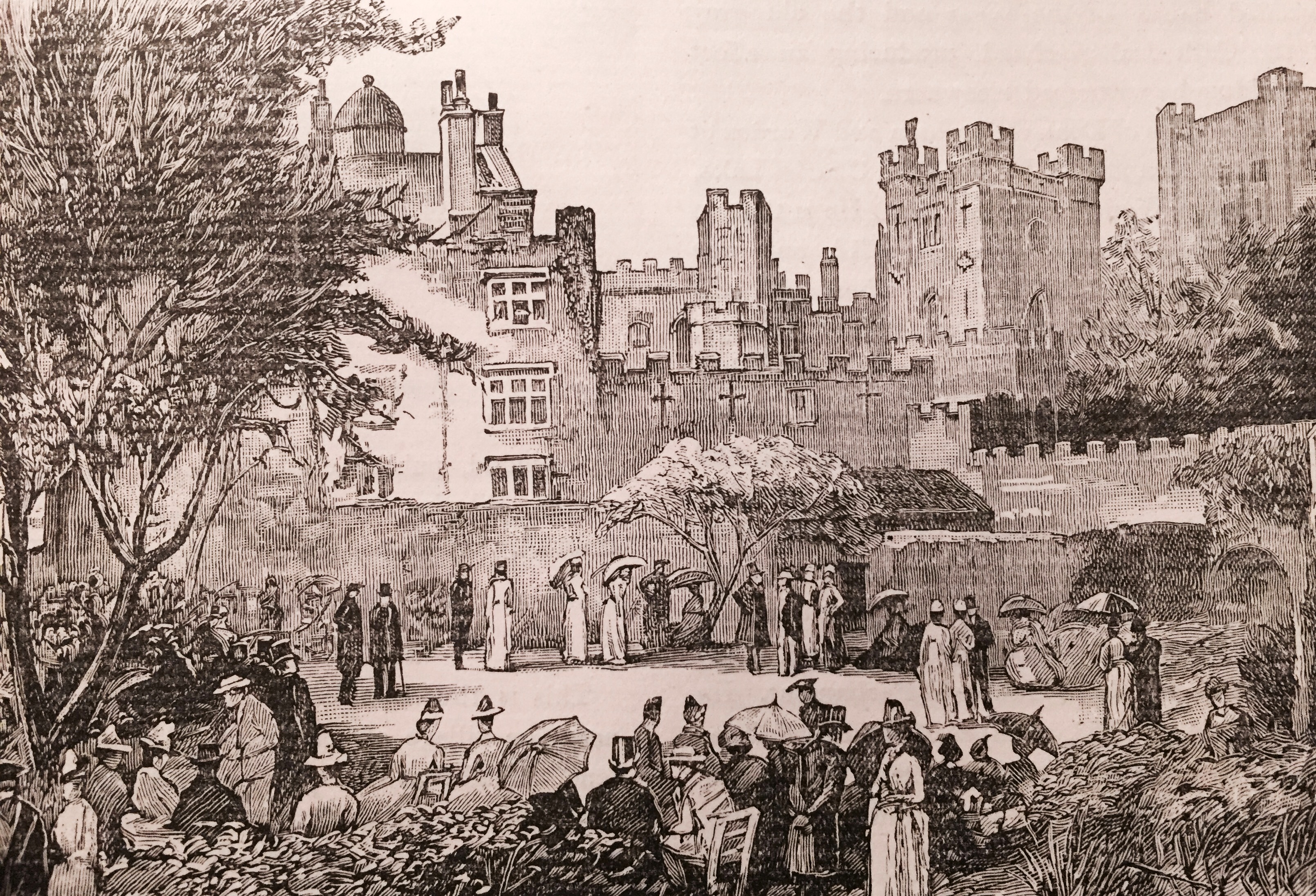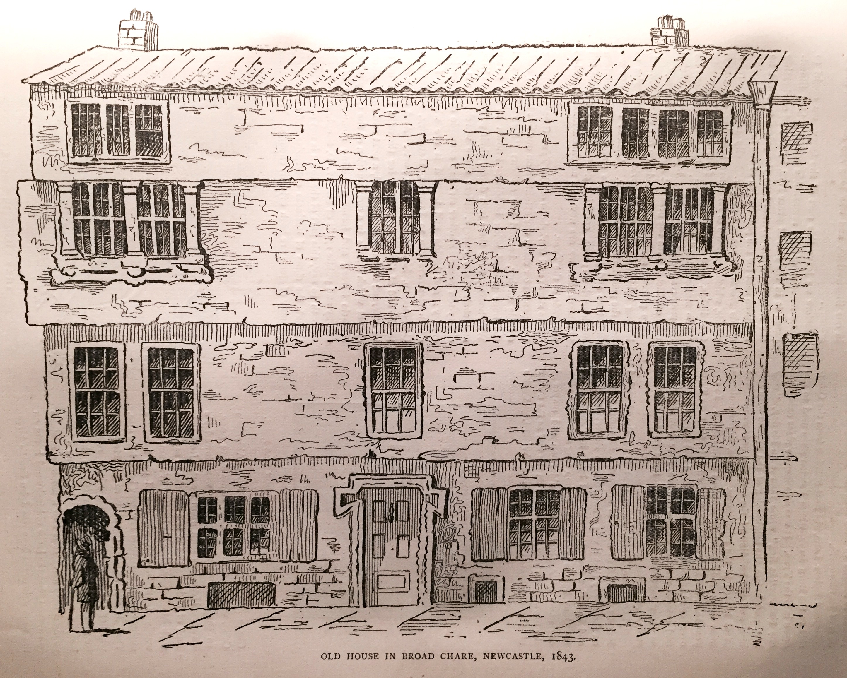 Next to Trinity Chare is the Broad Chare. Though narrow enough to our modern notions, it is certainly the broadest chare in this locality, and almost the only one that will admit a cart. It was the common thoroughfare of the town in the olden days; now it is given up to huge warehouses and to establishments devoted to the refreshment of the inner man. Two houses figured in our illustrations were interesting specimens of the old architecture of the locality. Both pictures are copied from sketches in the late Mr. John Waller’s copy of Mackenzie’s “History of Newcastle,” now the property of Mr. J. W. Pease. The High Dykes Tavern is supposed to have somehow got its name from the fosse or ditch which surrounded the town walls, and which was called the King’s Dykes. The house shown in our other picture is alleged to have been the mansion of the Liddells of Ravensworth.