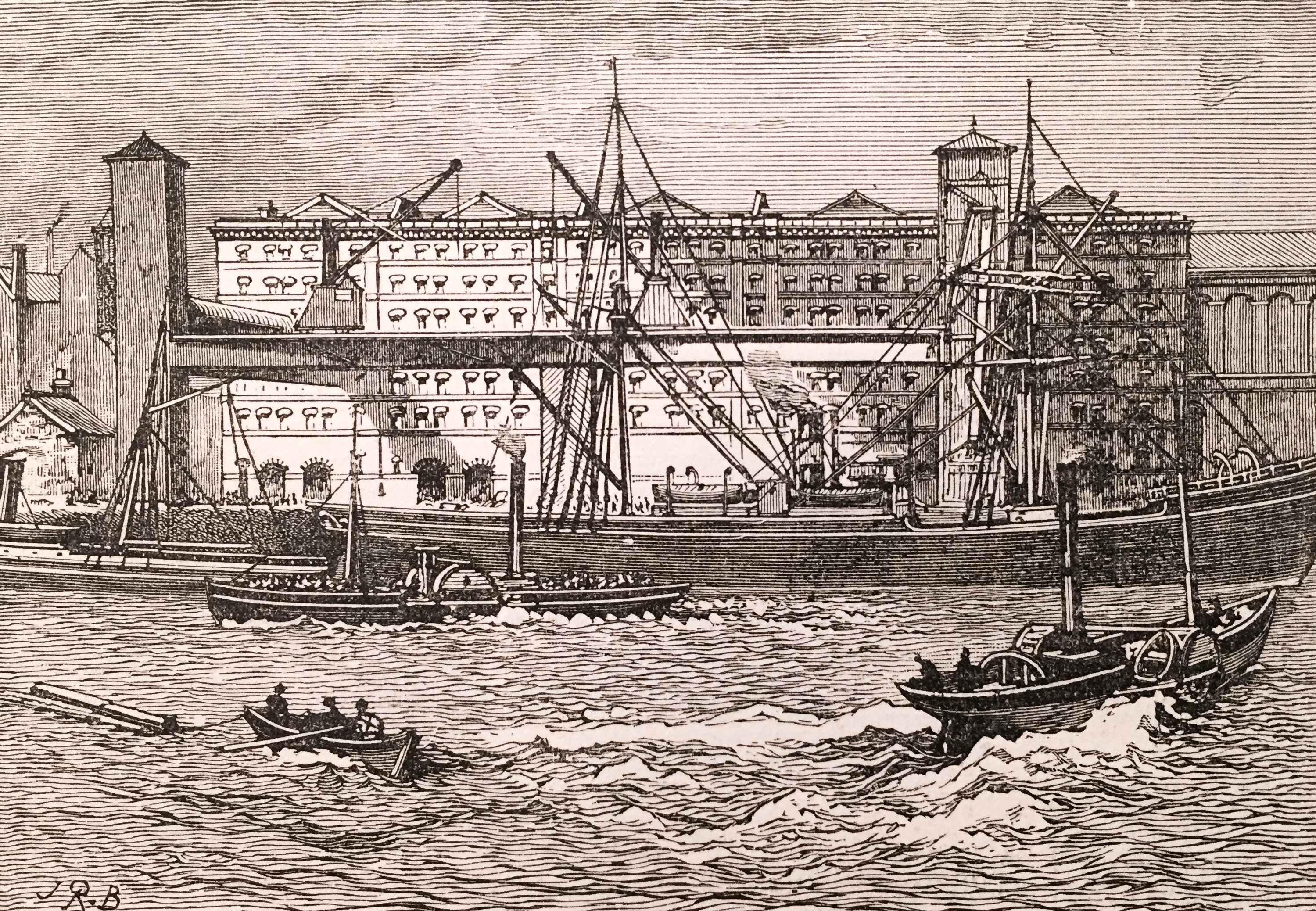 The stores and workshops of the Tyne Steam Shipping Company now claim our attention on our left hand; and, a little further, beyond the ancient “Swirle,” we find the huge pile of brick buildings known as the Grain Warehouses, with their iron doors, their ponderous lifts, and their many storeys. Near these warehouses is the eighty-ton crane another striking example of Tyneside energy; and beside and beyond it are wharves from which steamers run to London, Hamburg, Rotterdam, Copenhagan, Malmo, and other ports. And so we come to the end of the Quay proper, for the next building to be observed is the Sailors’ Bethel, a neat and commodious chapel which stands in a continuation of the Quay called Horatio Street, and forms a lasting monument of the energy and public spirit of Mr. W. D. Stephens, J.P.