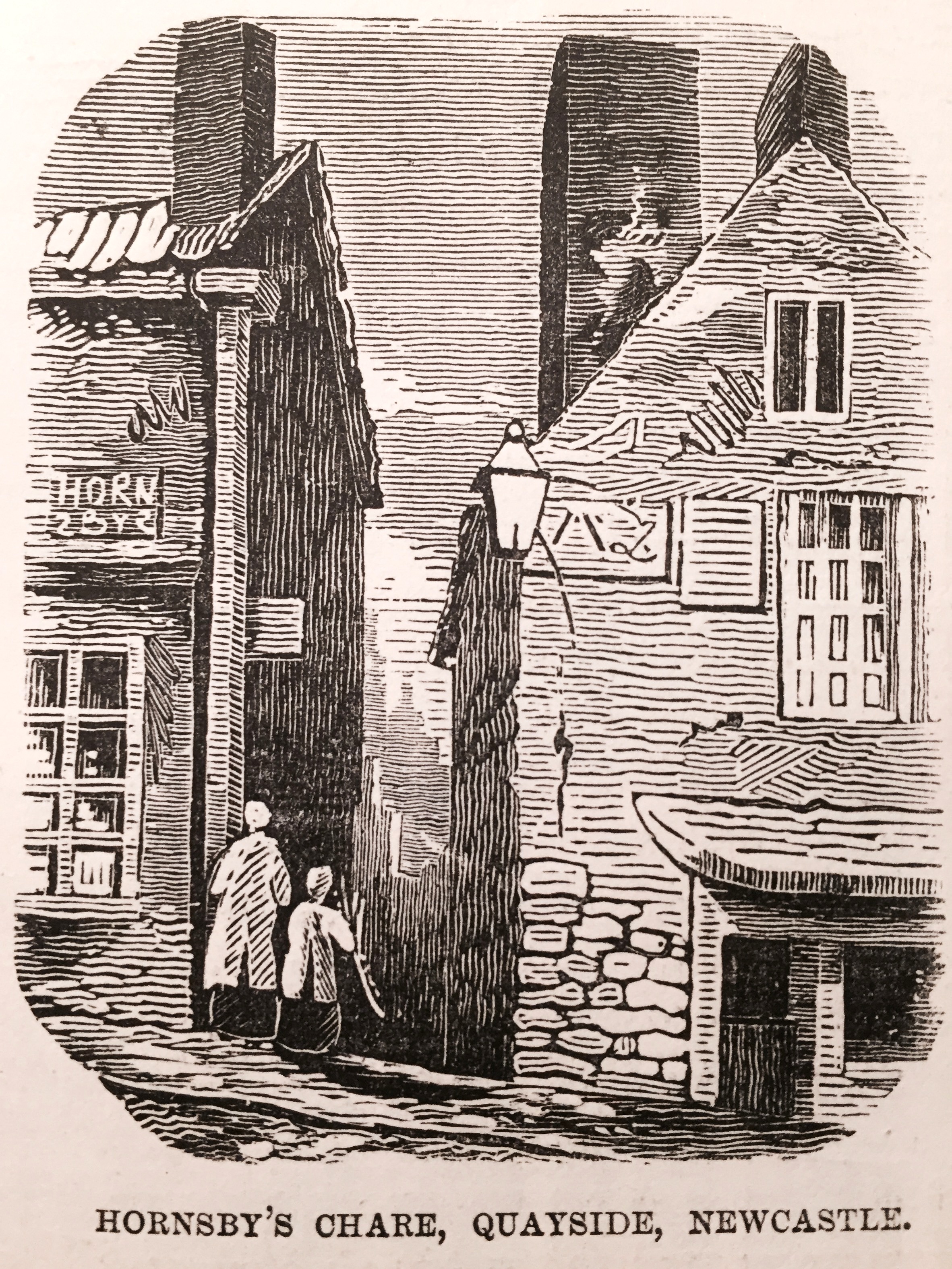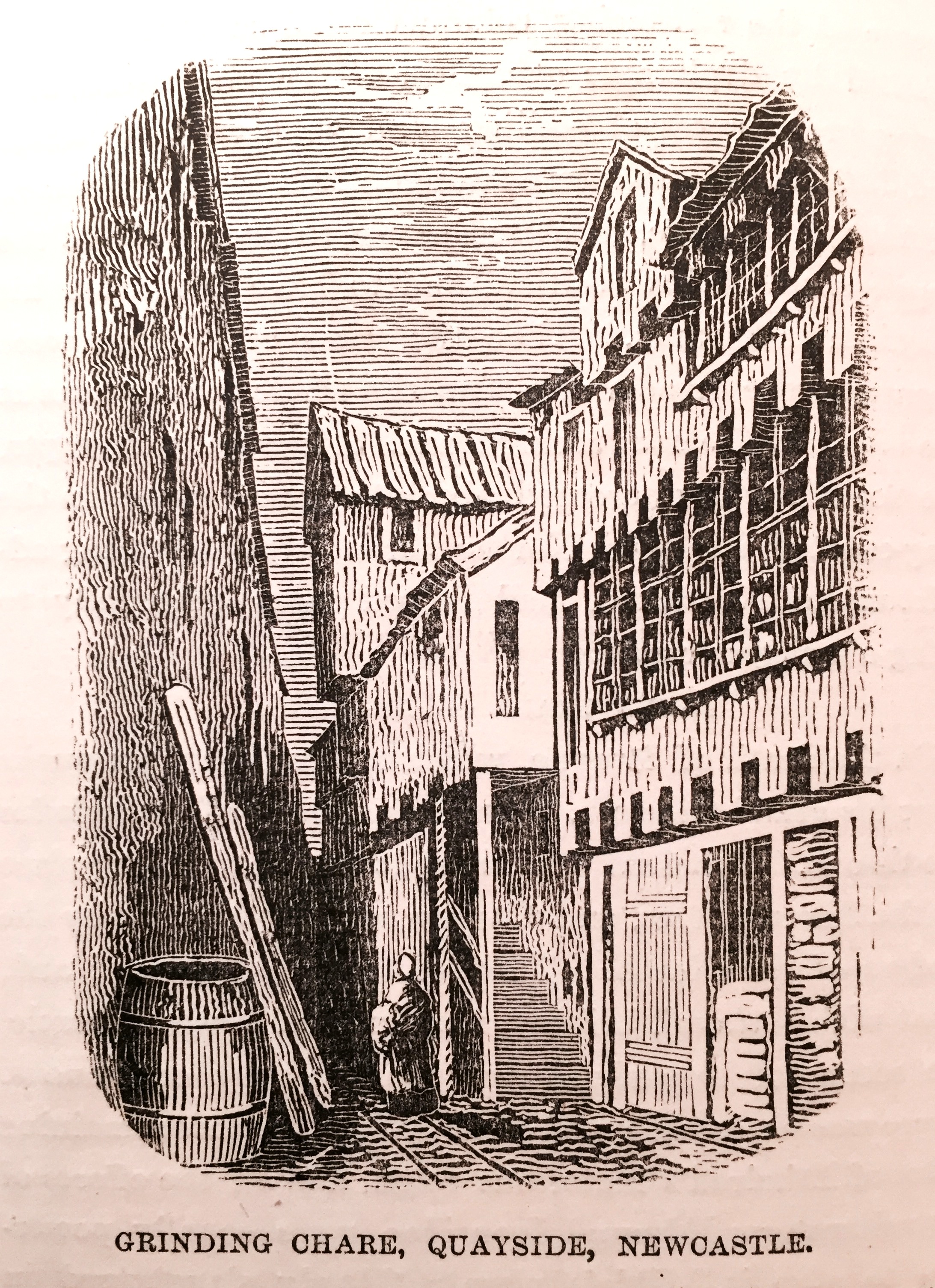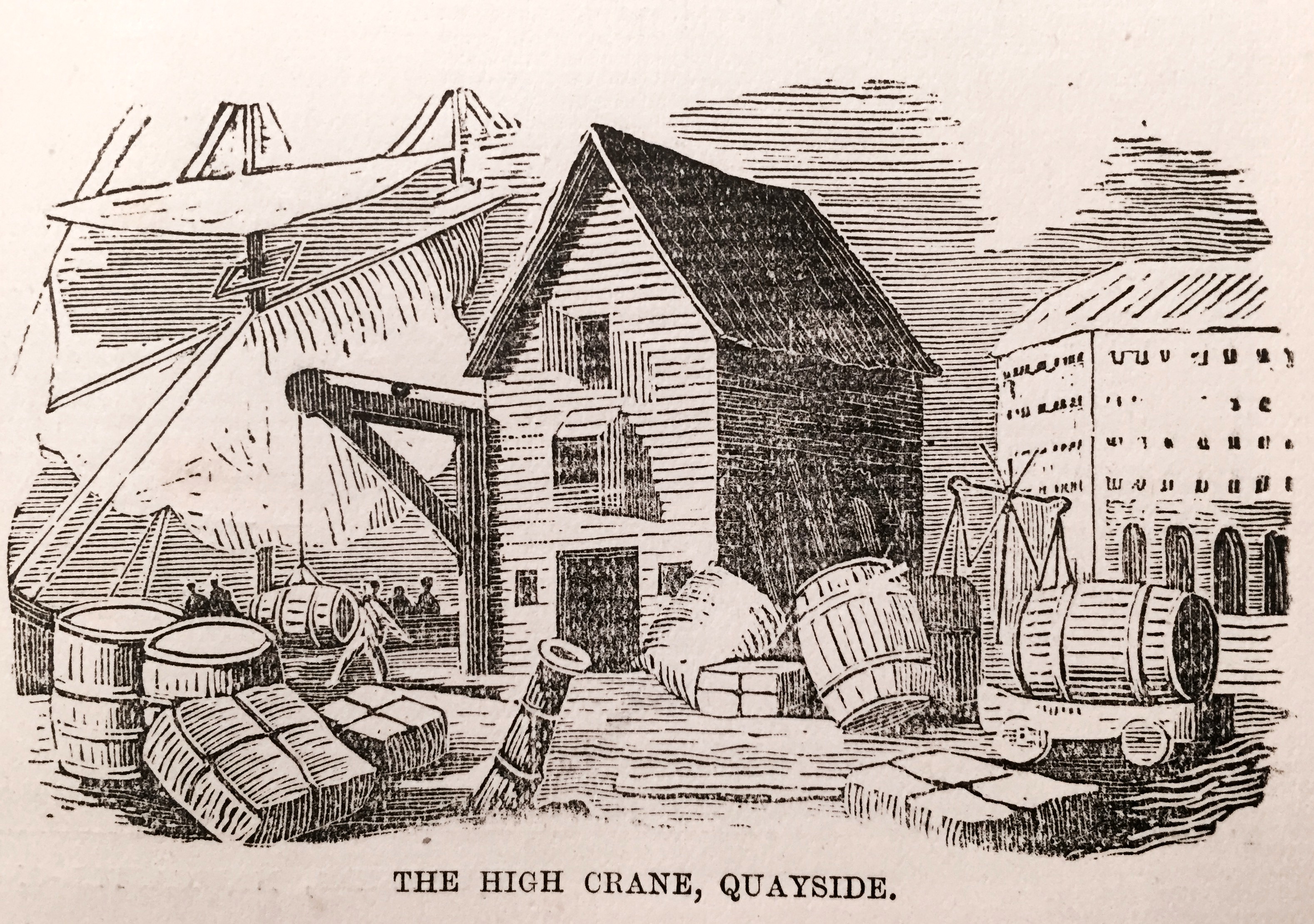 Our engravings of the High Crane, Grinding Chare, Homsby’s Chare, and the Glasshouse Bridge are reproduced from Richardson’s “Table Book.” The High Crane was situated near the Guildhall at the west end of the Quay.