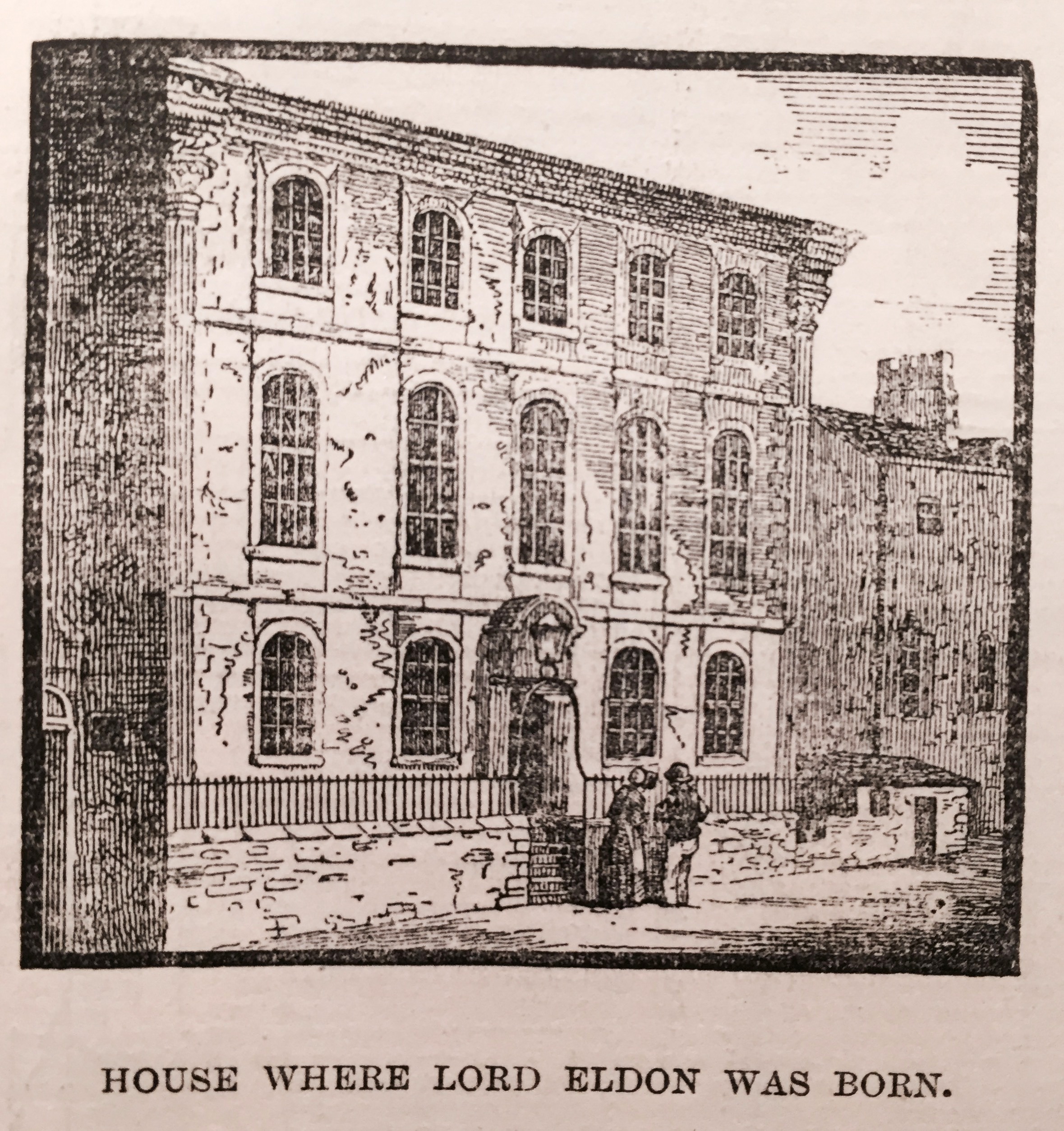 Byker Chare, which comes next, is by Brand styled Baker Chare. The name is accounted for easily enough on the theory that it was obtained from Robert de Byker and Laderine his wife, who had lands in Pandon. On the Quay here is the chemist’s shop long associated with the name of Anthony Nichol, alderman and mayor of the town in his day, and known on the turf as the owner of the celebrated race-horse, The Wizard. Cock’s Chare comes next: so named from Alderman Cock, who lived in it. Then comes Love Lane. In the seventeenth century it was Gowerley’s Rawe. Here was born John Scott, afterwards Earl of Eldon. But it is a mistake to say, even with Mackenzie, that his brother William, afterwards Lord Stowell, and one of our foremost authorities in maritime law, was born here also. That is not so. He was born at Heworth, whither his mother had been wisely removed for greater safety, as all Newcastle at the time was in a state of alarm at the rising of the young Pretender. It is also a common mistake to suppose that the large old-fashioned house on the west side of the lane was John Scott’s birthplace. It was on the east side (faithfully depicted in our illustration), and was long ago converted into a granary.