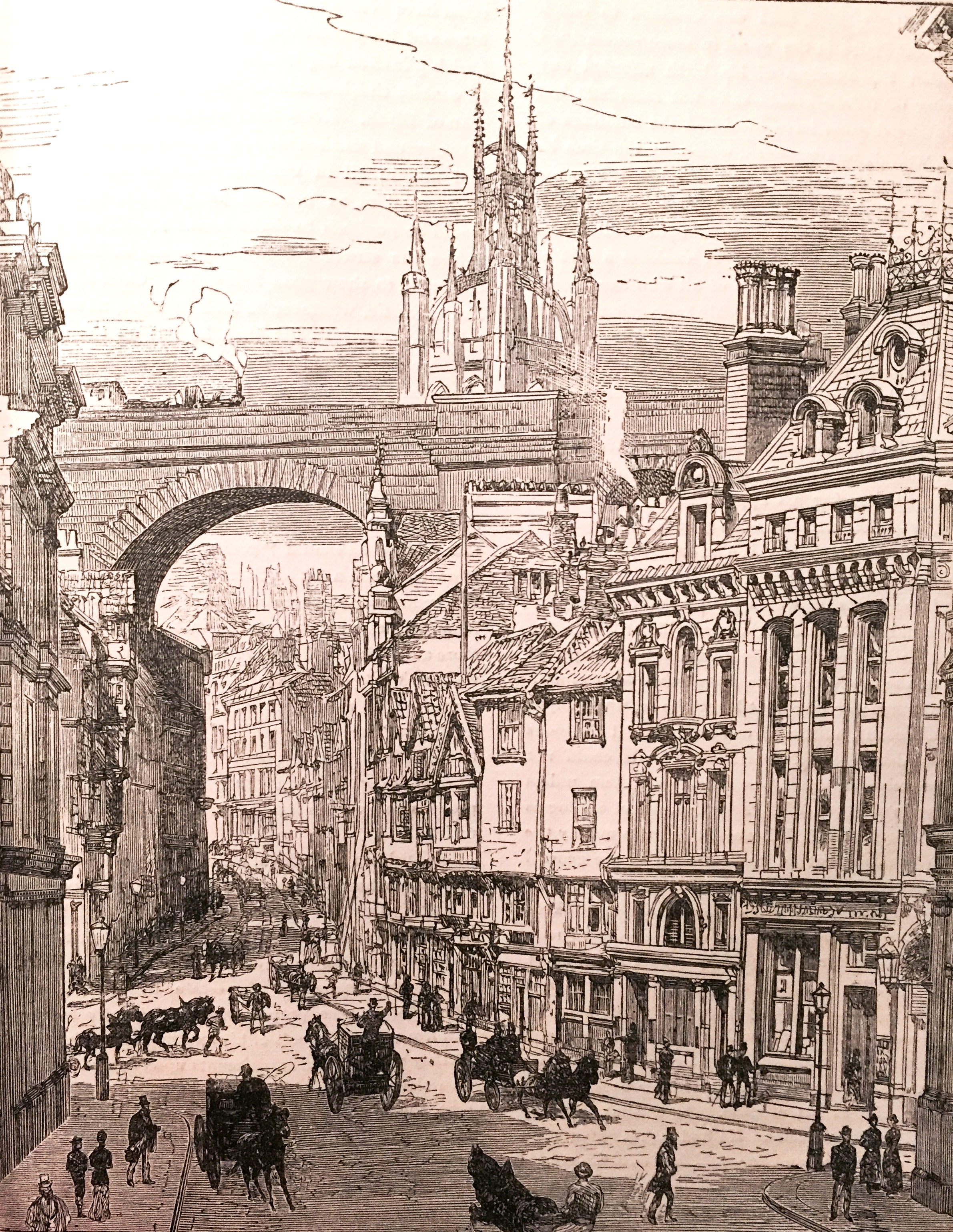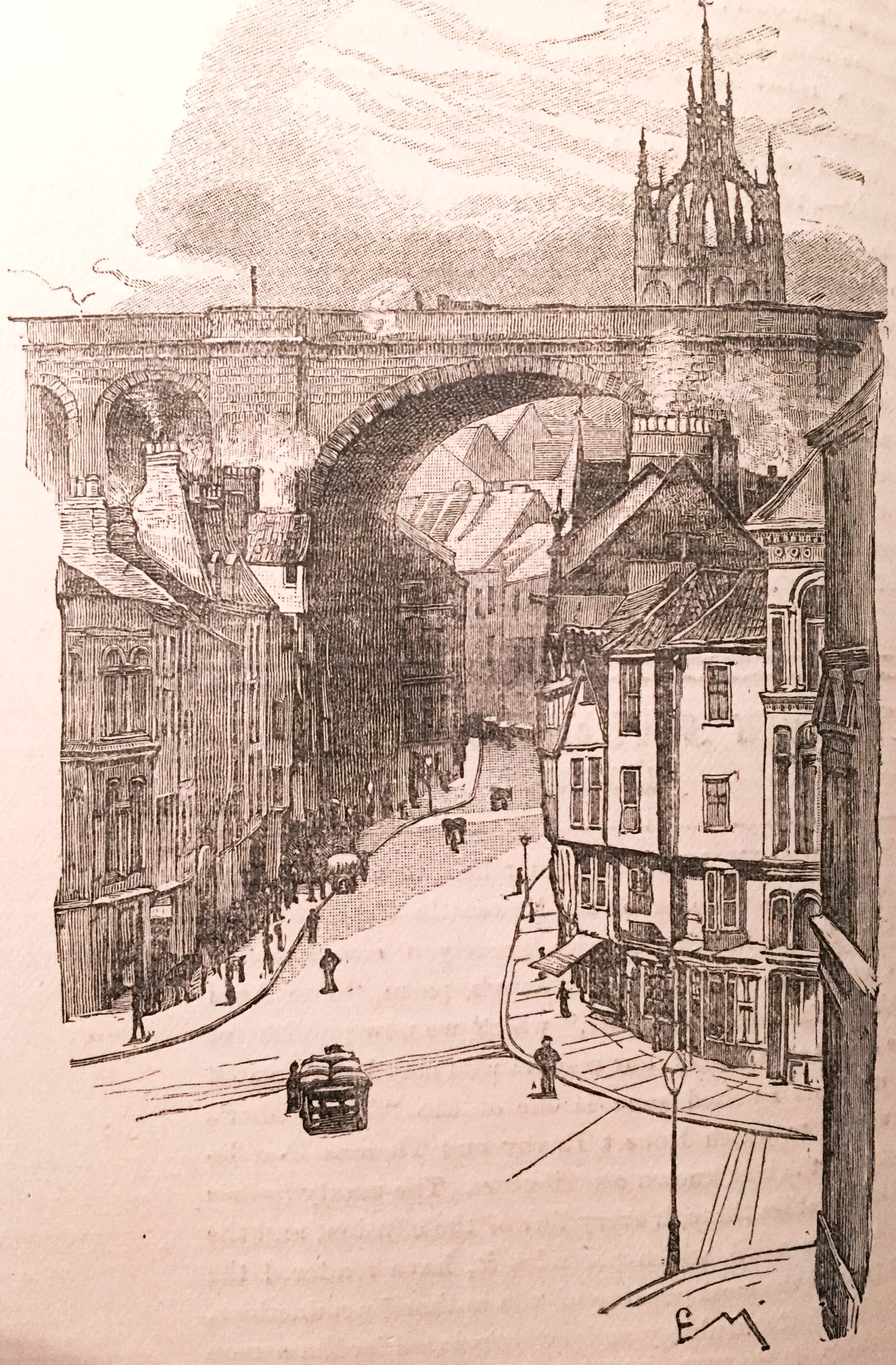 Sooth to say, this part of the town is not over inviting, though the signs of business enterprise and also of rigid economy of space are both evident enough. We continue on until we come to the little bridge across the streamlet called the Ouseburn, which gives its name to the district. The road by the river, from the end of Sandgate to this bridge, is called the North Shore, and is devoted to business purposes strictly. The roadway over the stream is usually known as the Glasshouse Bridge, and consists of one arch of stone. We gather from Bourne that it was originally a wooden structure. “But,” says he, “in the year 1669, when Ralph Jennison, Esq., was mayor, it was made of stone by Thomas Wrangham, shipwright, on account of lands which the town let him. The passage, however, over it was very difficult and uneven until the year 1729, when Stephen Coulson, Esq., was mayor, [and] it was made commodious and level both for horse and foot.” The little bridge was so named from the circumstance that the glass trade had long been carried on in its vicinity.